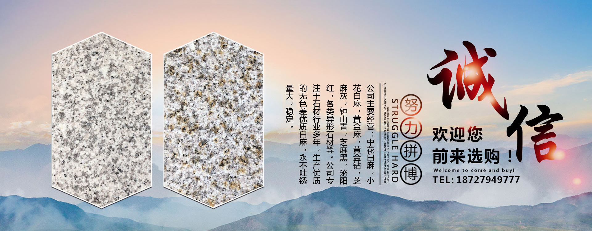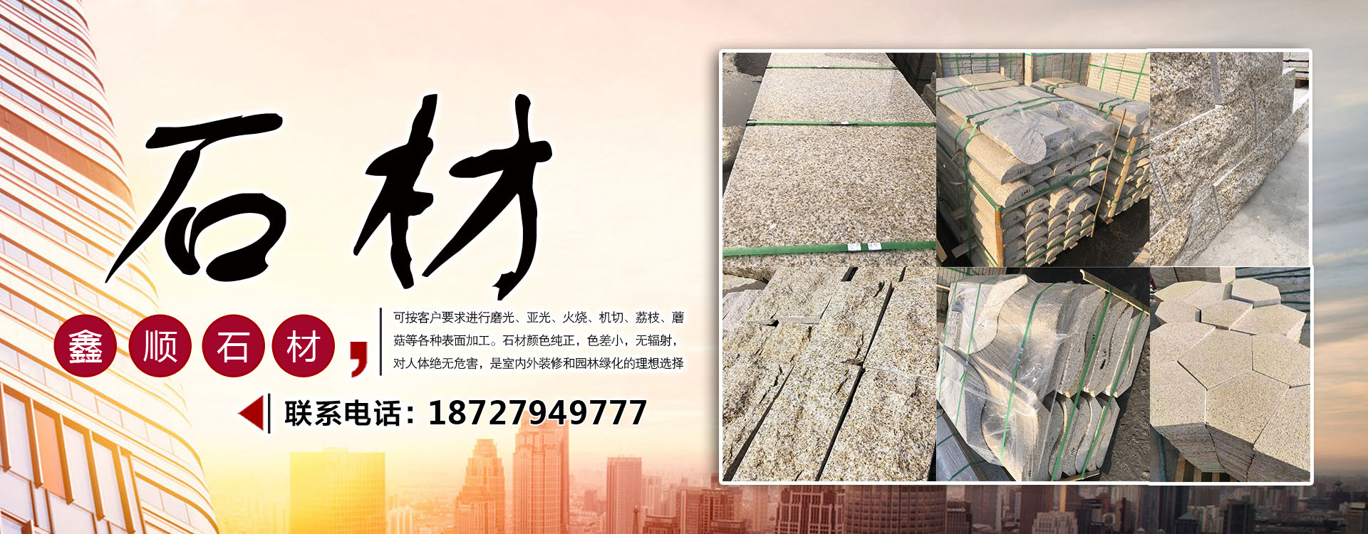 隨州市鑫順石材有限公司位于湖北省隨州市隨縣萬和鎮(zhèn)桐柏山。是一家集礦山開采、石材加工、異形制作、產品銷售為一體的大型綜合型石材企業(yè)!本公司主要經營:中花白麻,小花白麻,黃金麻,黃金鉆,芝麻灰,鐘山青,芝麻黑,泌陽紅,各類異形石材。生產的石材規(guī)格齊全、做工精細,被廣泛用于外墻干掛、廣場地鋪、市政園林、建筑工程、環(huán)境景觀異形石材等各類建筑墻體、地面的裝飾裝修。公司專注于石材行業(yè)多年,生產優(yōu)質的無色差優(yōu)質白麻,永不吐銹量大,穩(wěn)定,主攻高鐵站,地鐵站,機場等大型市政房產。可承接各種異形加工,速度快,質量無憂。我們秉承“誠信經營,服務為本”的經營理念,竭誠為廣大客戶提供優(yōu)質的產品和滿意服務,期待與您的合作,竭誠歡迎國內外新老客戶前來訂購洽談!